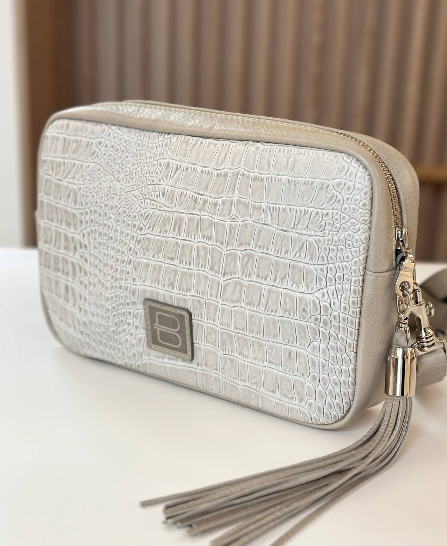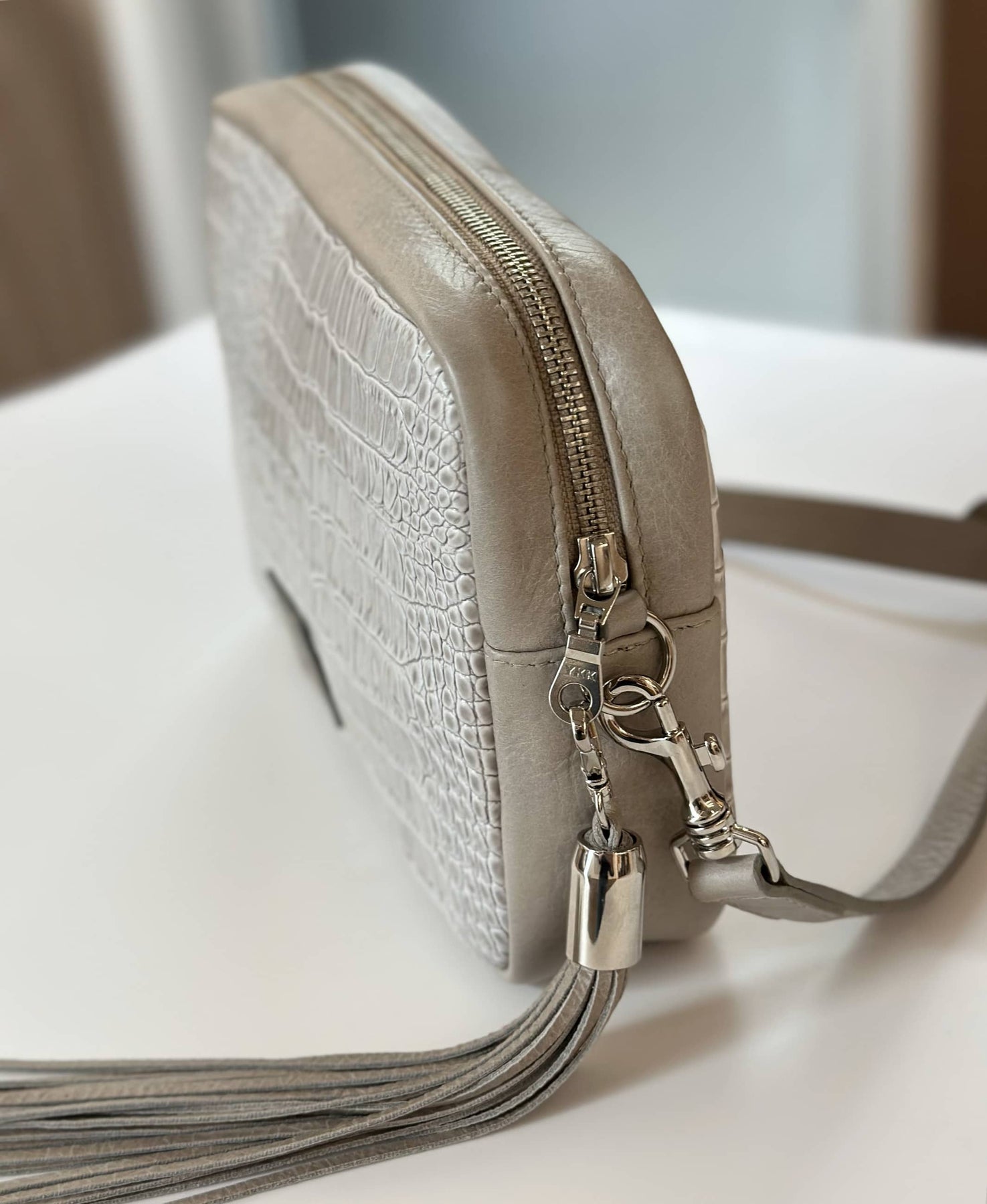 Meet the Sonnet bag. This hand-crafted shoulder bag features croc-embossed leather combined with a pebbled nappa leather trim. Includes an adjustable leather shoulder strap, and removable leather tassel.
