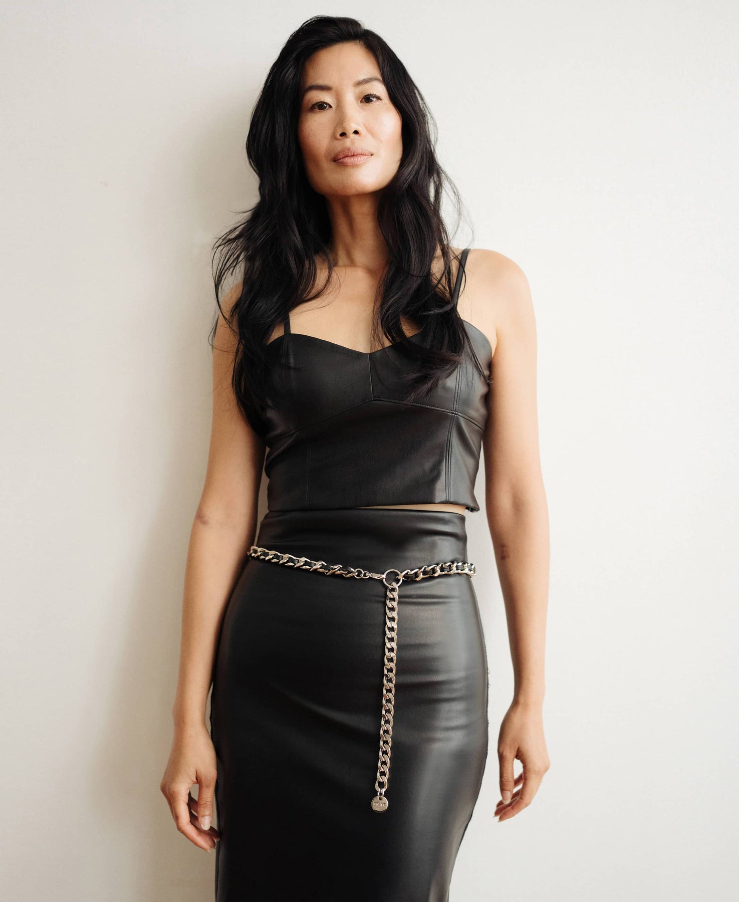 The Doone Chain Belt sits on the waist adding an edgy glam to any look. Featuring a woven leather chain with center front closure.