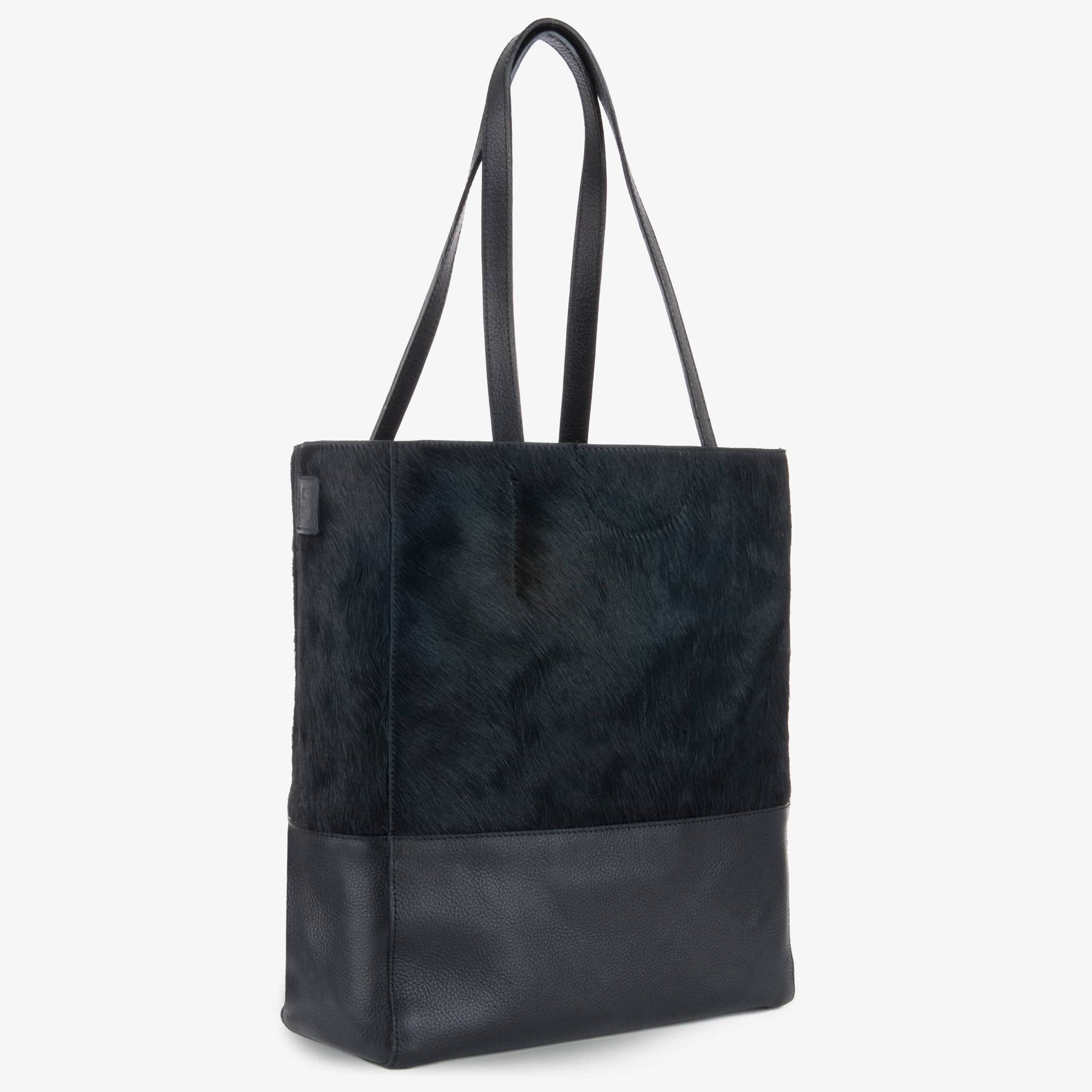 Our best-selling tote body combines a solid vegetable tanned leather at the base and a hair-on hide leather on the top, offering durability and softness.